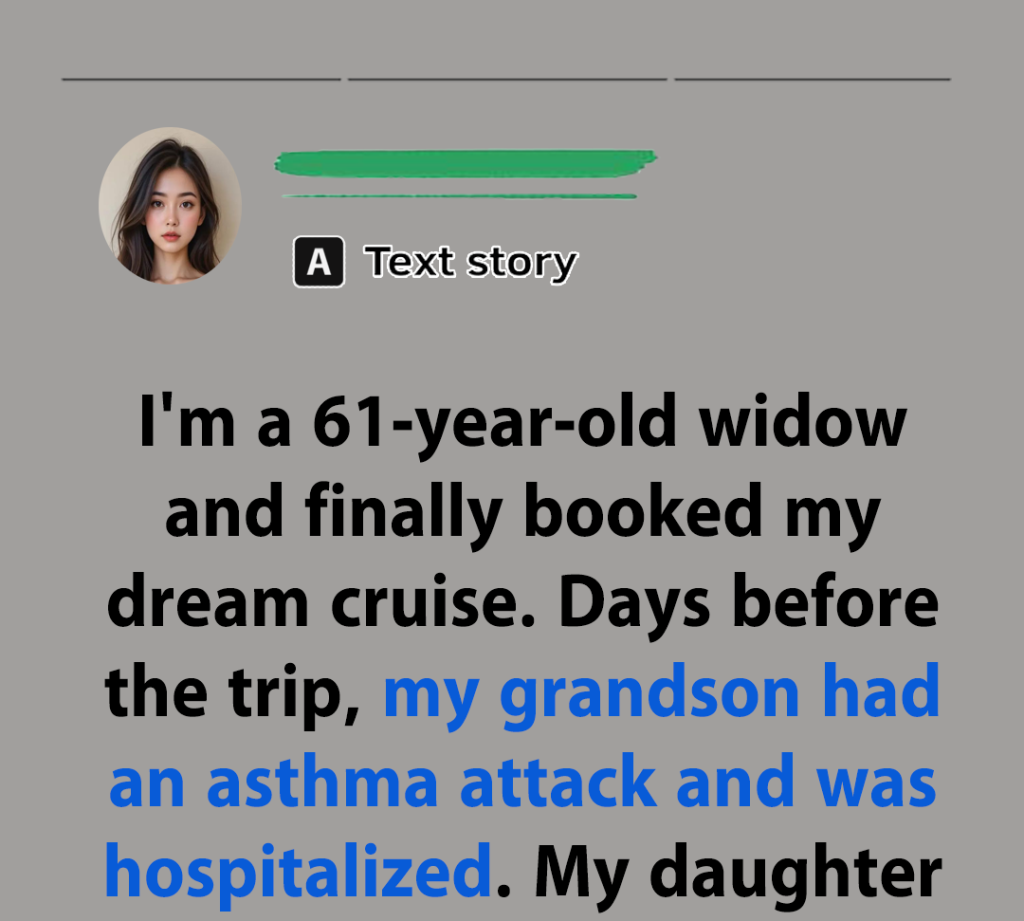 I’m a 61-year-old widow, and I finally booked a dream cruise I’d been planning for years. Three days before departure, my daughter called — my 6-year-old grandson had a serious asthma attack and was hospitalized. She asked me to cancel the trip and come help with her other two kids.