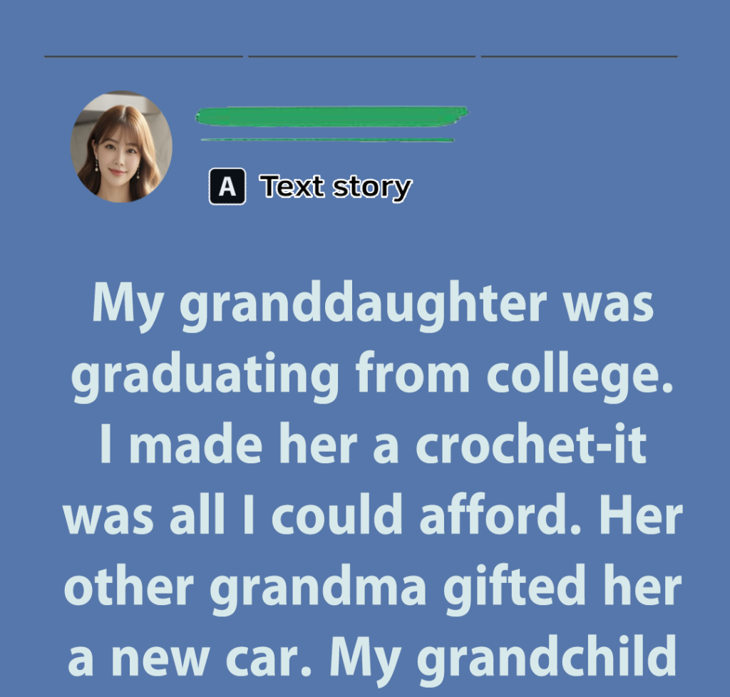 - My granddaughter was graduating from college. I made her a crochet; it was all I could afford. Her other grandma gifted her a brand-new car. My granddaughter didn’t even notice my gift. I felt so small and left early.