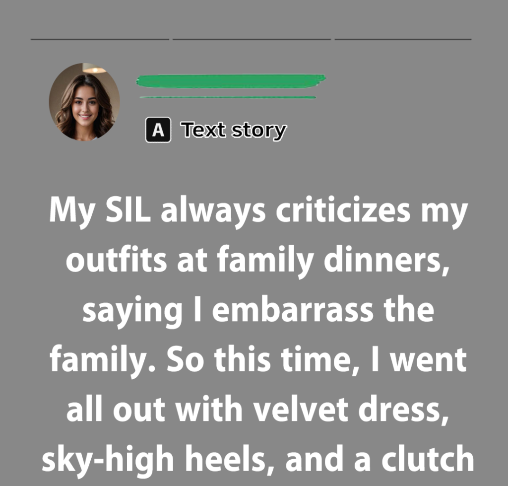 - My SIL always criticizes my outfits at family dinners, saying I embarrass the family. So this time, I went all out with a velvet dress, sky-high heels, and a clutch that screamed designer. When I walked in, the room went silent.