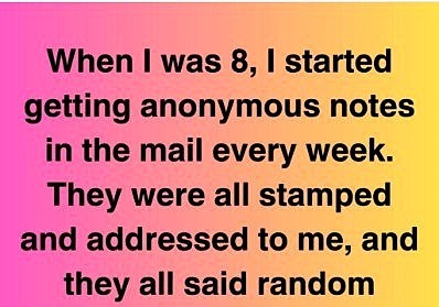 Beginning when I was eight years old, I began receiving anonymous messages in the mail on a weekly basis. There was a stamp on each one of them, and they were all addressed to me. Some of them stated weird things. My parents were uneasy about it and insisted on bringing them with them on their trip.