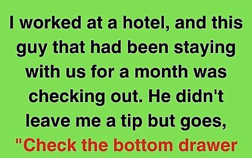 The month-long guest was checking out when I worked at a hotel. He said, “Check the bottom drawer on the nightstand, that’s for you.” No tip. I walk to his room and find this small brown package in the bottom drawer. It appeared normal, folded shut—not sealed.