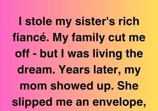 I stole my sister’s rich fiancé. My family cut me off — but I was living the dream. Years later, my mom showed up. She slipped me an envelope, saying, “Even you don’t deserve this.” I froze when I saw the photo of my husband with a man in bed.