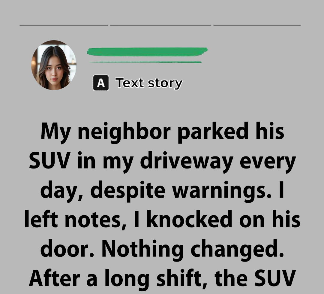 I’ve got this neighbor who treats my driveway like it’s his personal parking spot. Big black SUV parked like he’s marking territory. The first time it happened, I figured it was an honest mistake. We share a narrow street, and space is tight. So I left a note on his windshield: “Hey, friendly reminder—this driveway belongs to me :)” The smiley face was me trying to keep things civil. But the next day, he was in the same spot. No note in return. Just his giant SUV sitting there like a middle finger.