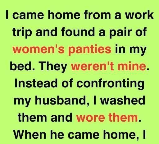 Not mine. A delicate, unfamiliar pair of panties, smugly perched on my side of the bed. I didn’t scream.