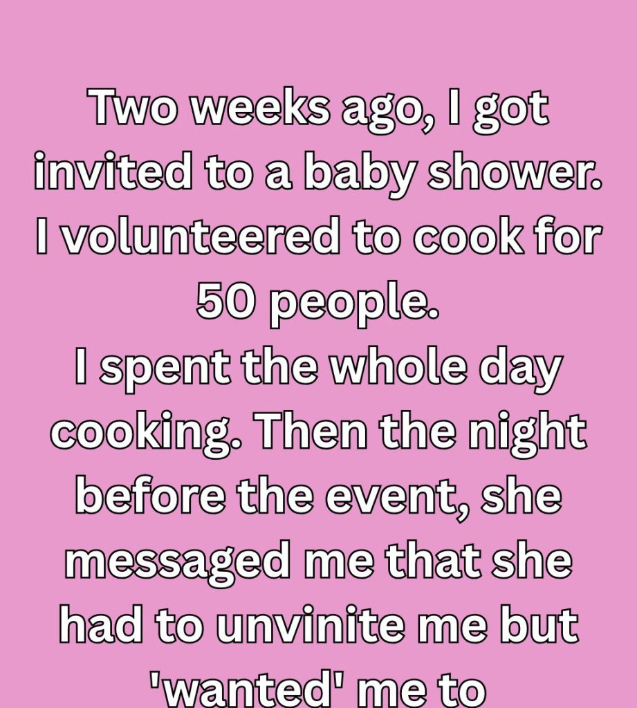 The next day, I heard from mutual friends that the baby shower didn’t go well. They ran out of food, and guests were disappointed.