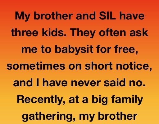 My brother and SIL have three kids. They often ask me to babysit for free, sometimes on short notice, and I have never said no. Recently, at a big family gathering, my brother praised me for being such a good aunt.