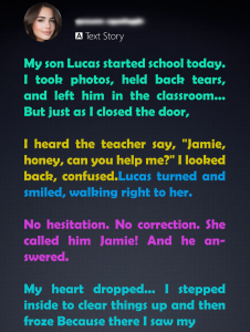 And then she turned her head enough to see her face. It was HER. Lucas’s first-grade TEACHER. The woman who had called my son Jamie.