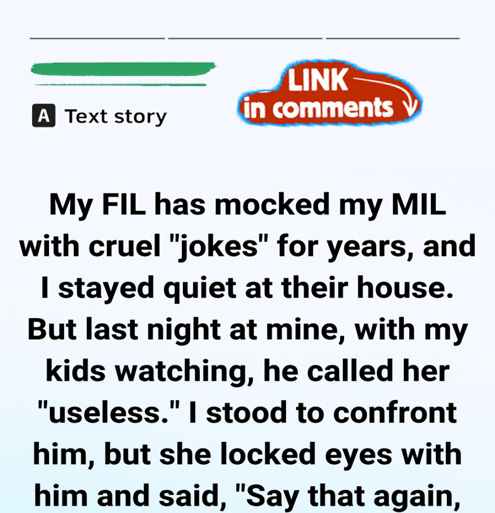 My FIL (68M) has always made nasty little “jokes” at my MIL’s expense. At their house, I usually kept my mouth shut, thinking it wasn’t my place to step in. But last night, at our house, he crossed a line.