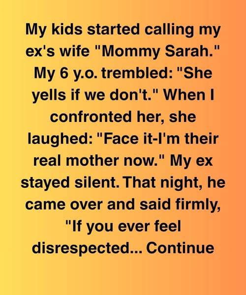 My kids started calling my ex’s wife “Mommy Sarah.” My 6-year-old trembled: “She yells if we don’t.” When I confronted her, she laughed: “Face it—I’m their real mother now.” My ex stayed silent. That night, he came over and said firmly, “If you ever feel disrespected…”