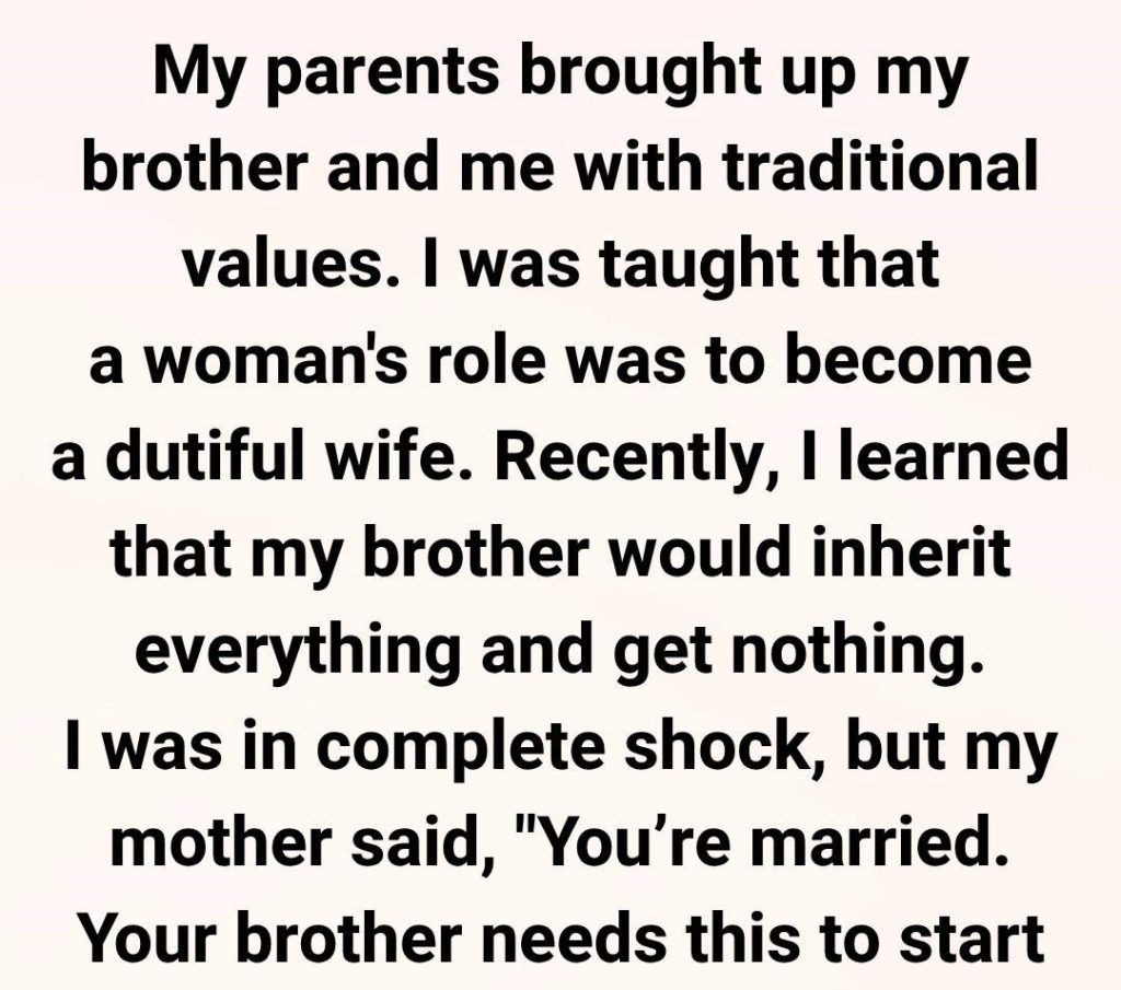 The will further explained that since I’m married and my husband takes care of me, I don’t need any inheritance. They believed my brother, as a man, should have it all because one day he would have his own family to support. It even went on to say that, as their daughter, my responsibility was now to my husband’s family, not my own.”