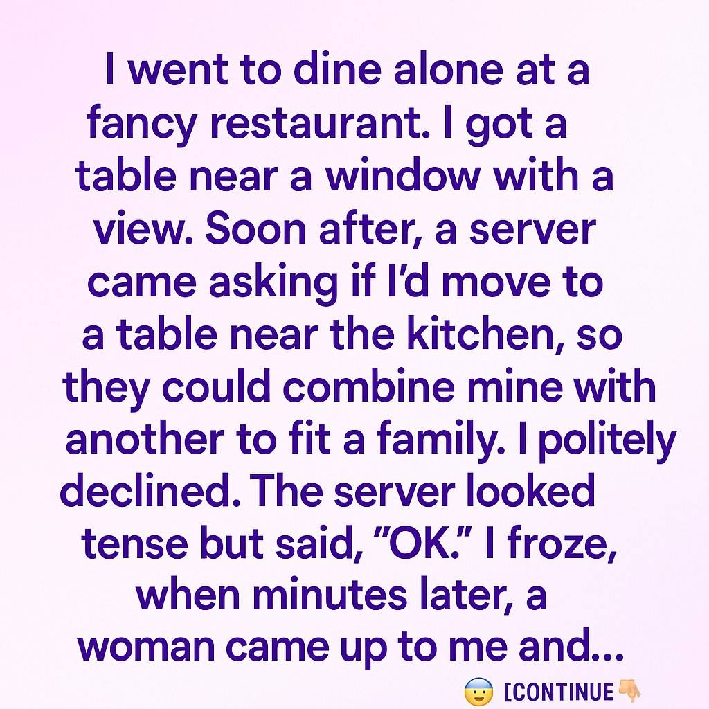 I went to dine alone at a fancy restaurant. I got a table near a window with a view. Soon after, a server came asking if I’d move to a table near the kitchen, so they could combine mine with another to fit a family.