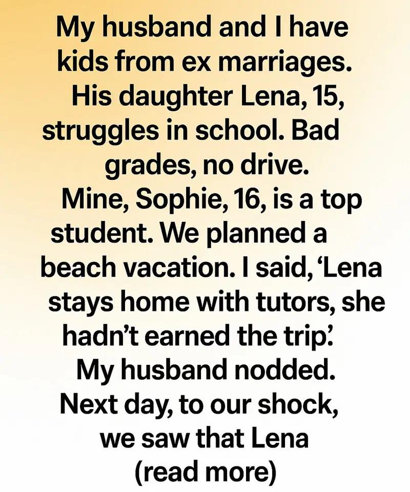 My husband and I both have children from previous marriages. His daughter, Lena, 15, has been struggling in school — poor grades, no motivation. My daughter, Sophie, 16, is the opposite: focused, ambitious, and consistently at the top of her class.