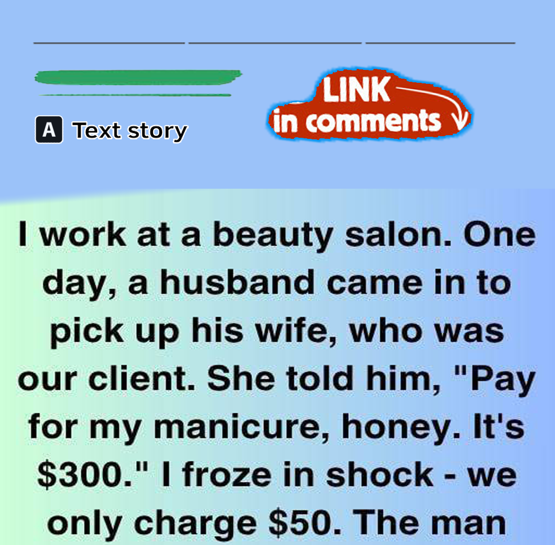 I work at a beauty salon. One day, a husband came in to pick up his wife, who was our client. She told him, “Pay for my manicure, honey.