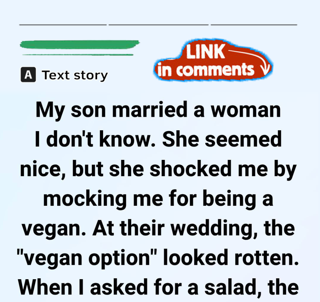 But when it came time for the reception, things took a turn. There was no assigned seating, so I looked around and found a table marked with a small sign that read “vegan option.” It felt considerate, even thoughtful — a sign that maybe my daughter-in-law had planned ahead after all. I sat down with a quiet smile, relieved.