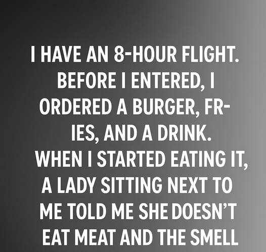 I have an 8-hour flight. Before I entered, I ordered a burger, fries, and a drink. When I started eating it, a lady sitting next to me told me she doesn’t eat meat and that the smell was making her sick.