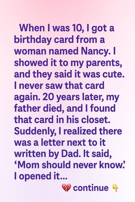 Two decades later, while sorting through my father’s belongings after his passing, I found the card tucked carefully inside a small box. Beside it rested a folded note in my father’s handwriting, marked with the words: “Mom should never know.”