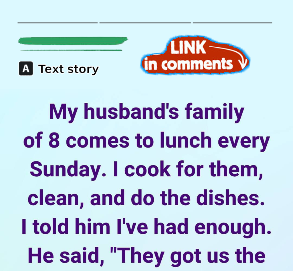 Every week, my husband’s family of eight came over for lunch. I cooked, cleaned, and smiled through the chaos, trying to keep the peace while managing everything. One morning, I told my husband I needed a break.