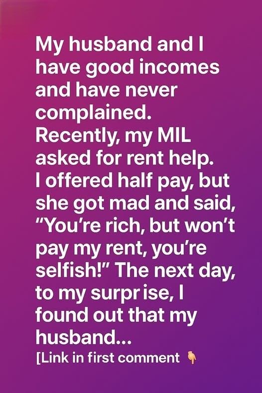My husband and I have good incomes and have never complained. Recently, my MIL asked for rent help. I offered half pay, but she got mad and said, “You’re rich, but won’t pay my rent, you’re selfish!” The next day, to my surprise, I found out that my husband…had already been secretly covering her rent for months.