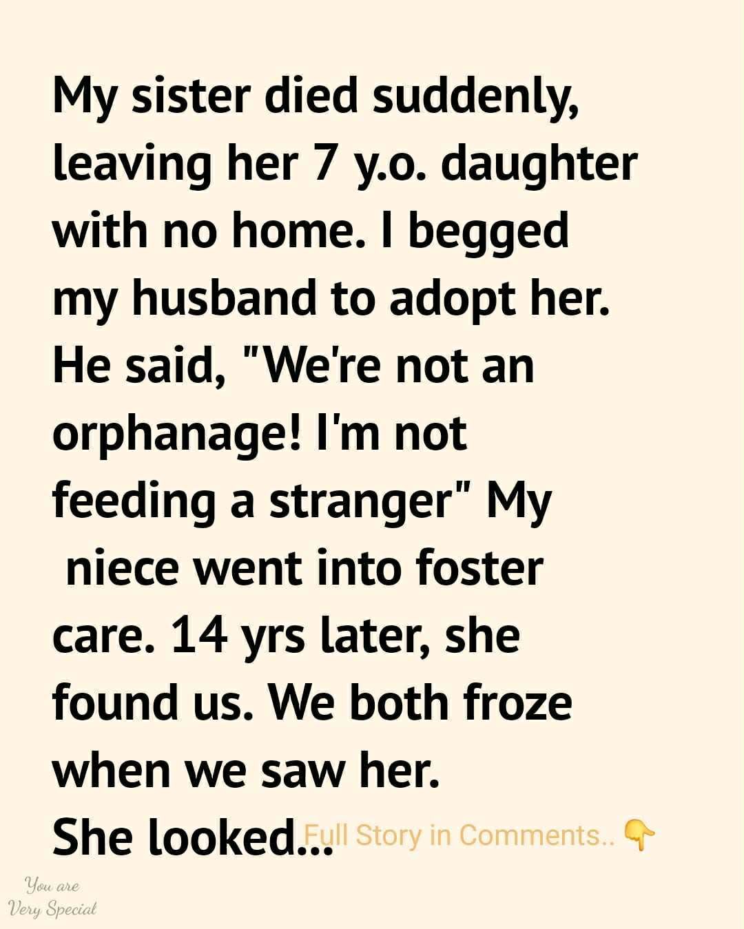 Then, fourteen years later, a young woman came to our door. She had kind eyes and a hopeful smile. I instantly knew it was her — no longer a scared child, but a confident, gentle adult. She said she had always wondered about us, not with anger, but with curiosity and kindness. My husband stood beside me, quiet and full of regret. We listened as she told us about her life.
