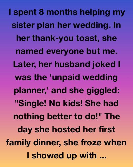 I spent 8 months helping my sister plan her wedding. In her thank-you toast, she named everyone but me. Later, her husband joked I was the “unpaid wedding planner,” and she giggled: “Single!
