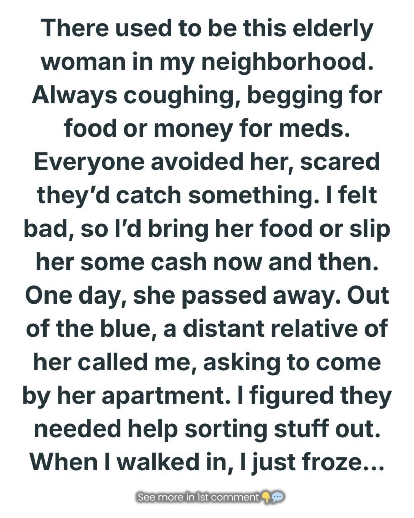 I never thought much about it—just small gestures anyone could make. Then one day, I learned she had passed away, and her distant relative asked me to come to her apartment. I thought they needed help organizing her things, but the moment I stepped inside, everything changed.