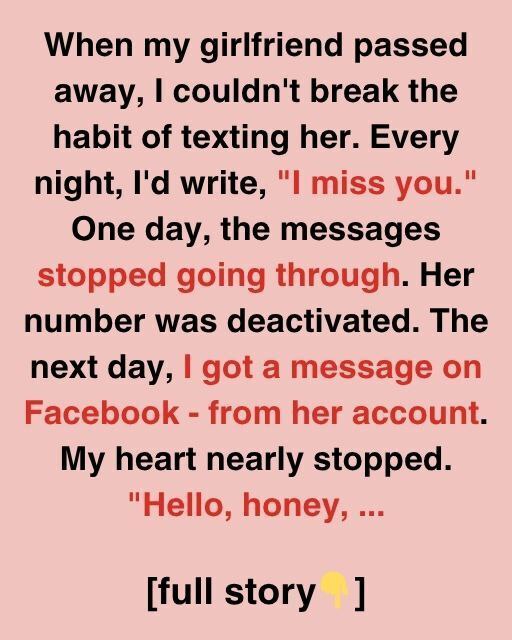 When my girlfriend passed away, I couldn’t break the habit of texting her. Every night, I’d write, “I miss you.” One day, the messages stopped going through. Her number was deactivated. The next day, I got a message on Facebook – from her account. My heart nearly stopped. “Hello, honey,” it read.