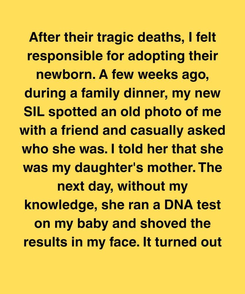 After their tragic deaths, I felt responsible for adopting their newborn. A few weeks ago, during a family dinner, my new sister-in-law spotted an old photo of me with a friend and casually asked who she was. I told her that she was my daughter’s mother. The next day, without my knowledge, she ran a DNA test on my baby and shoved the results in my face. It turned out… she wasn’t biologically mine at all.