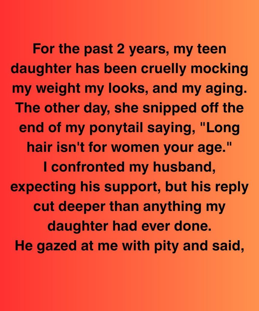 For the past 2 years, my teen daughter has been cruelly mocking my weight, my looks, and my aging. The other day, she snipped off the end of my ponytail saying, “Long hair isn’t for women your age.”