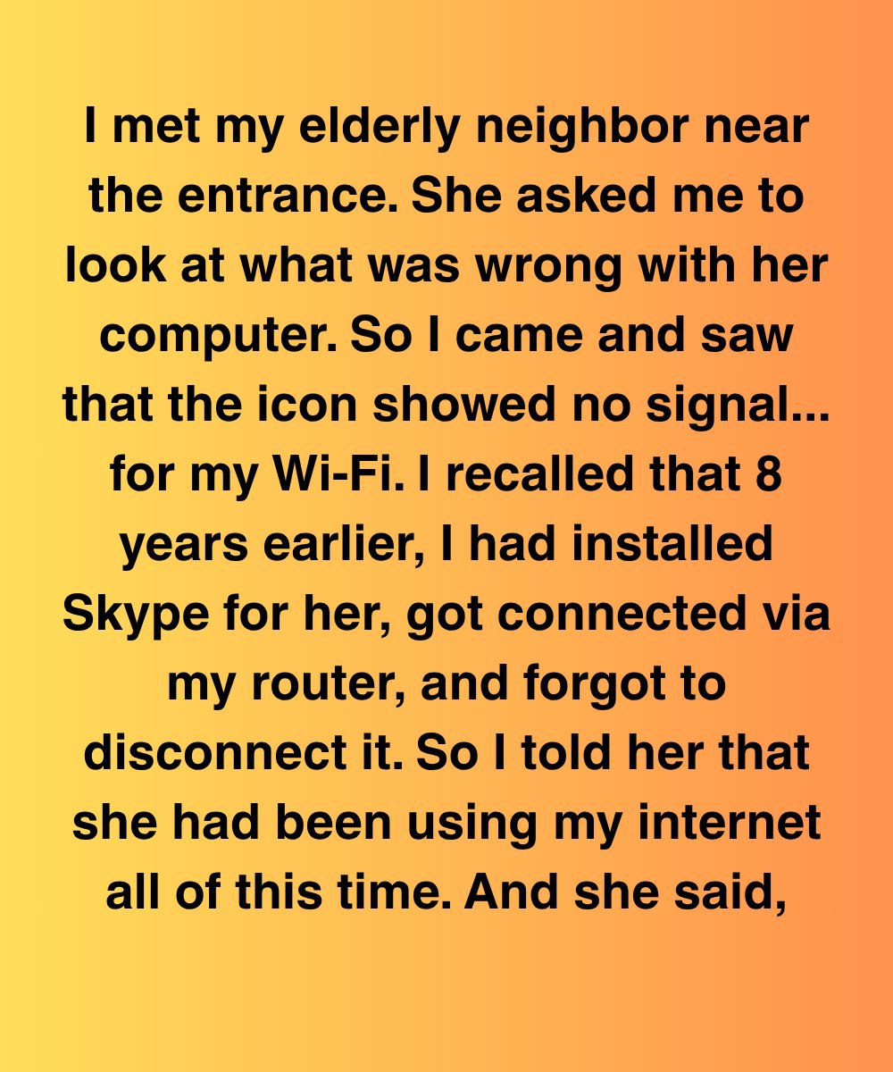 “I met my elderly neighbor near the entrance. She asked me to look at what was wrong with her computer. So I came and saw that the icon showed no signal… for my Wi-Fi. I recalled that 8 years earlier, I had installed Skype for her, got connected via my router, and forgot to disconnect it. So I told her that she had been using my internet all of this time. And she said,”