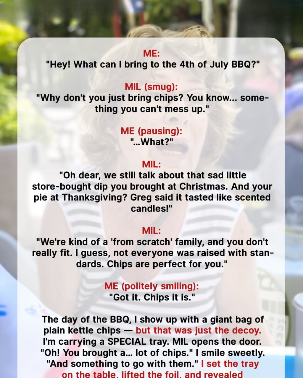 At the BBQ, the moment I unveiled my chip cones, the crowd went wild. Guests swarmed the tray, asking for the recipe and snapping photos. I played it cool, popping one into my mouth while my MIL’s smile stretched thinner by the minute. When someone complimented her “famous” berry tart, I casually pulled out the receipts I’d found in her trash store-bought, both of them. The tart and the cobbler. Her face turned a glorious shade of red.