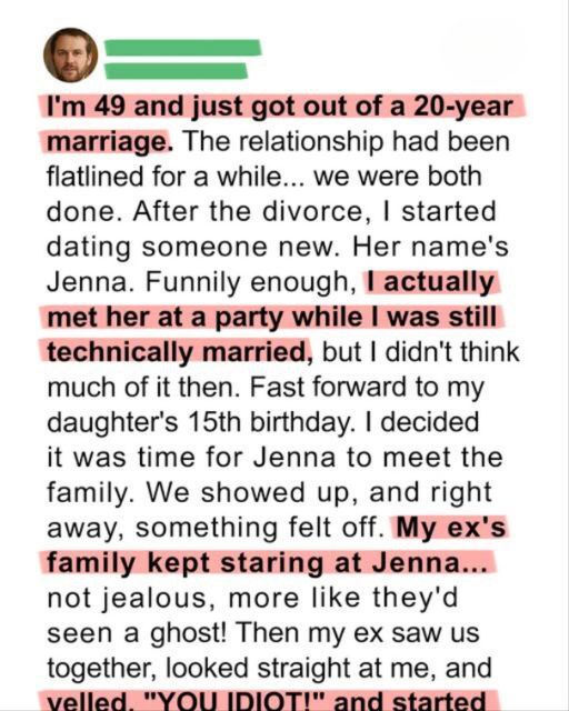 “I’m 49 and just got out of a 20-year marriage. The relationship had been flatlined for a while… we were both done. After the divorce, I started dating someone new. Her name’s Jenna. Funnily enough, I actually met her at a party while I was still technically married, but I didn’t think much of it then. Fast forward to my daughter’s 15th birthday. I decided it was time for Jenna to meet the family. We showed up, and right away, something felt off. My ex’s family kept staring at Jenna… not jealous, more like they’d seen a ghost! Then my ex saw us together, looked straight at me, and yelled, “YOU IDIOT!” and started shouting about how stupid I was for bringing her to the party.”