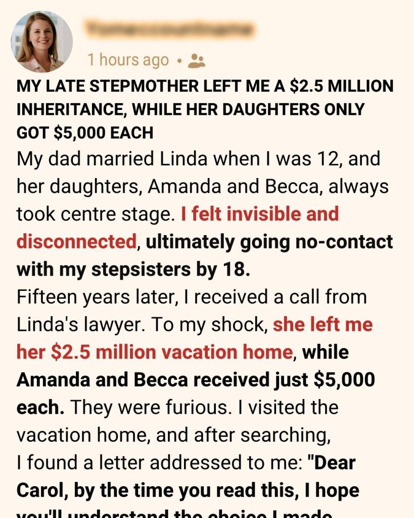 My late stepmother left me a $2.5 million inheritance, while her daughters received only $5,000 each.