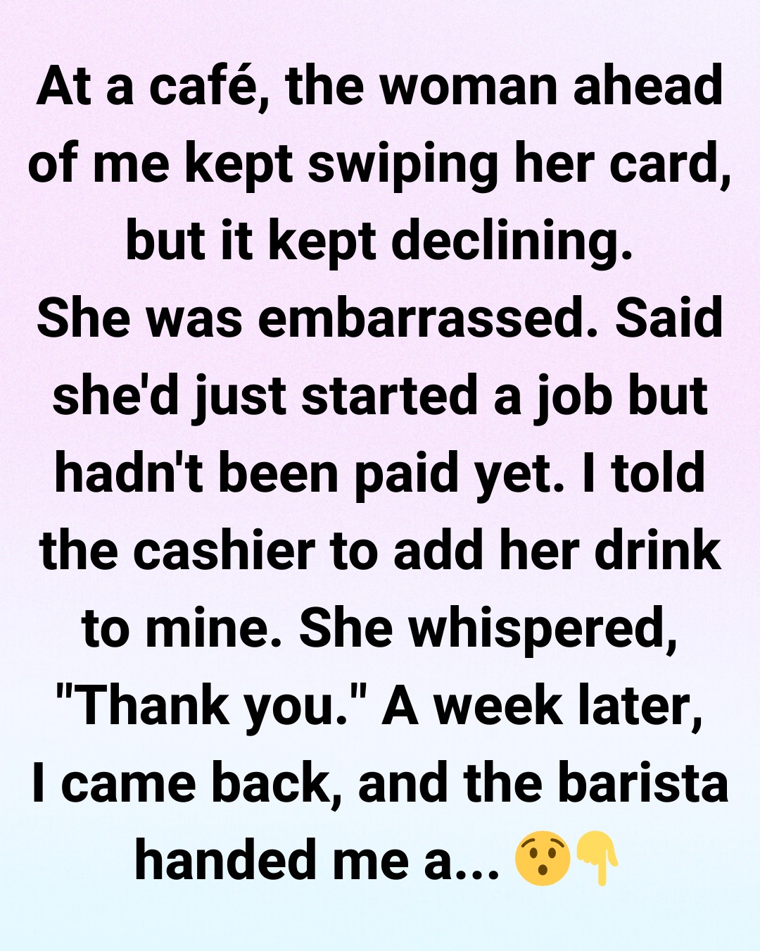 The woman froze for a moment, like she wasn’t sure she heard me right. When she turned around, her eyes were glossy, and she looked like she might burst into tears. She only managed a soft, shaky, “Thank you,” before stepping away with her drink. I gave her a small smile, told her it was no big deal, and assumed that was the end of the story. We were strangers, after all.