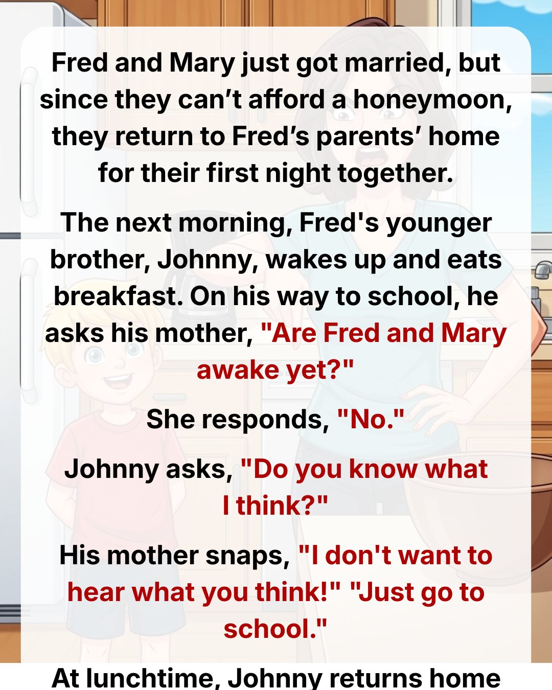 The next morning, Fred’s younger brother, Johnny, wakes up and eats breakfast. On his way to school, he asks his mother, “Are Fred and Mary awake yet?”