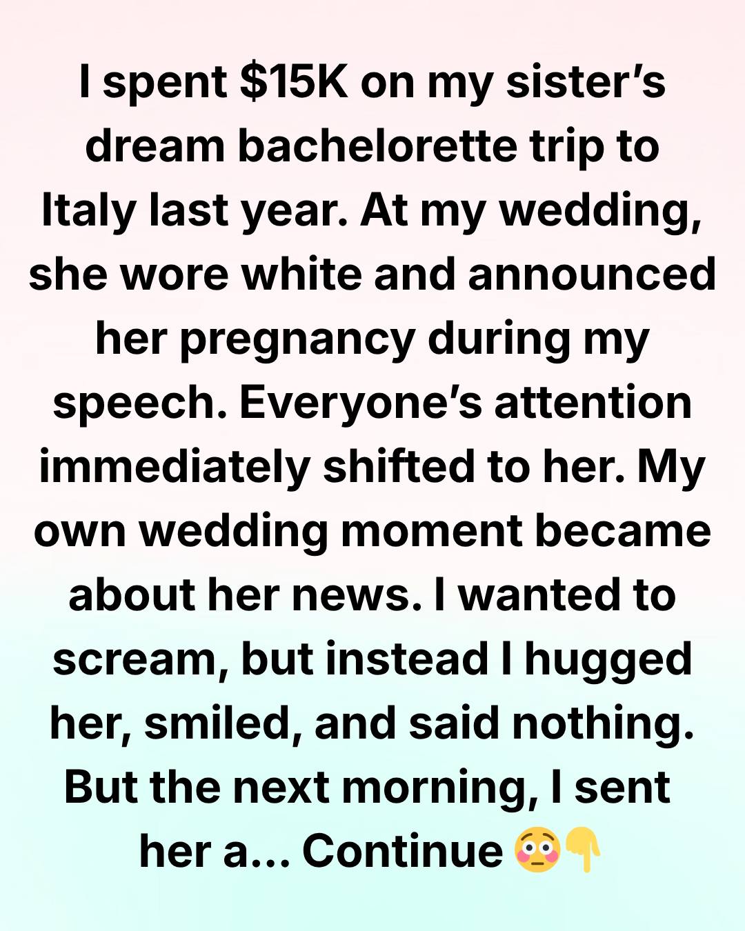 I spent $15,000 on my sister Emma’s dream bachelorette trip to Italy last year. I wanted her to have something truly special before her wedding, so I paid for everything—flights, hotels, activities, all of it. She kept telling me how lucky she was to have me and how she would never forget what I did.