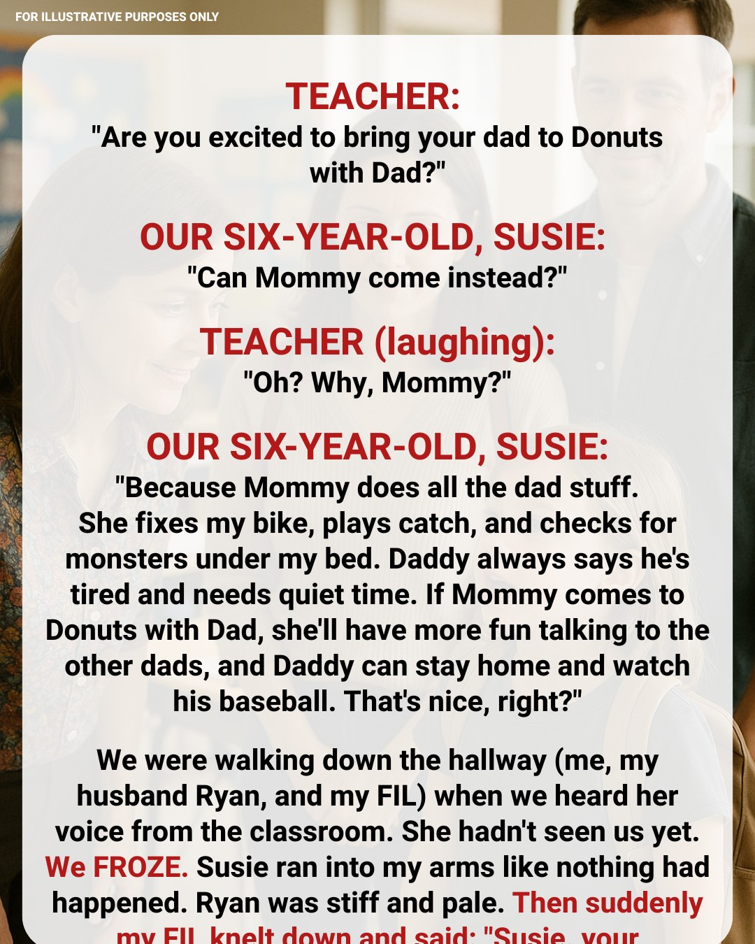 Ryan had taken the rare afternoon off, and his father, Tom, joined us to pick up Susie. The school buzzed with flyers and glittery posters for “Donuts with Dad,” an annual event that filled children with soda-bubble excitement.