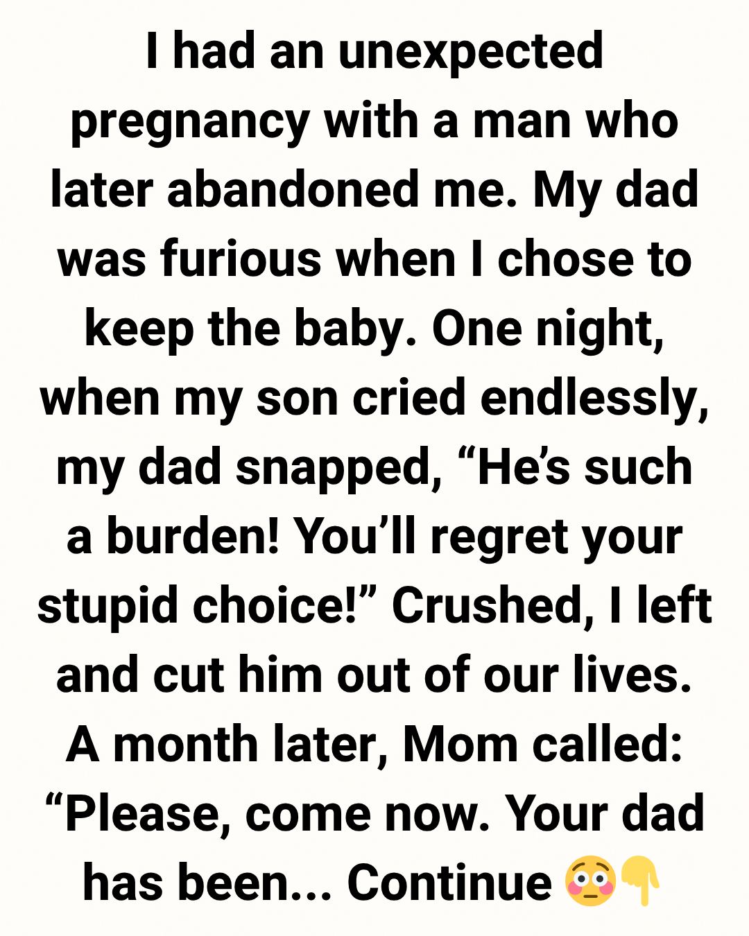 Weeks passed, and the silence from my parents’ house was deafening. My mom texted me now and then, asking how the baby was doing, but I kept my distance. I told myself I was protecting my son—from pain, from rejection, from the man who had once called him a burden. And yet, beneath my anger, there was a quiet ache. I missed my dad—or rather, the version of him I used to know before those cruel words tore us apart.