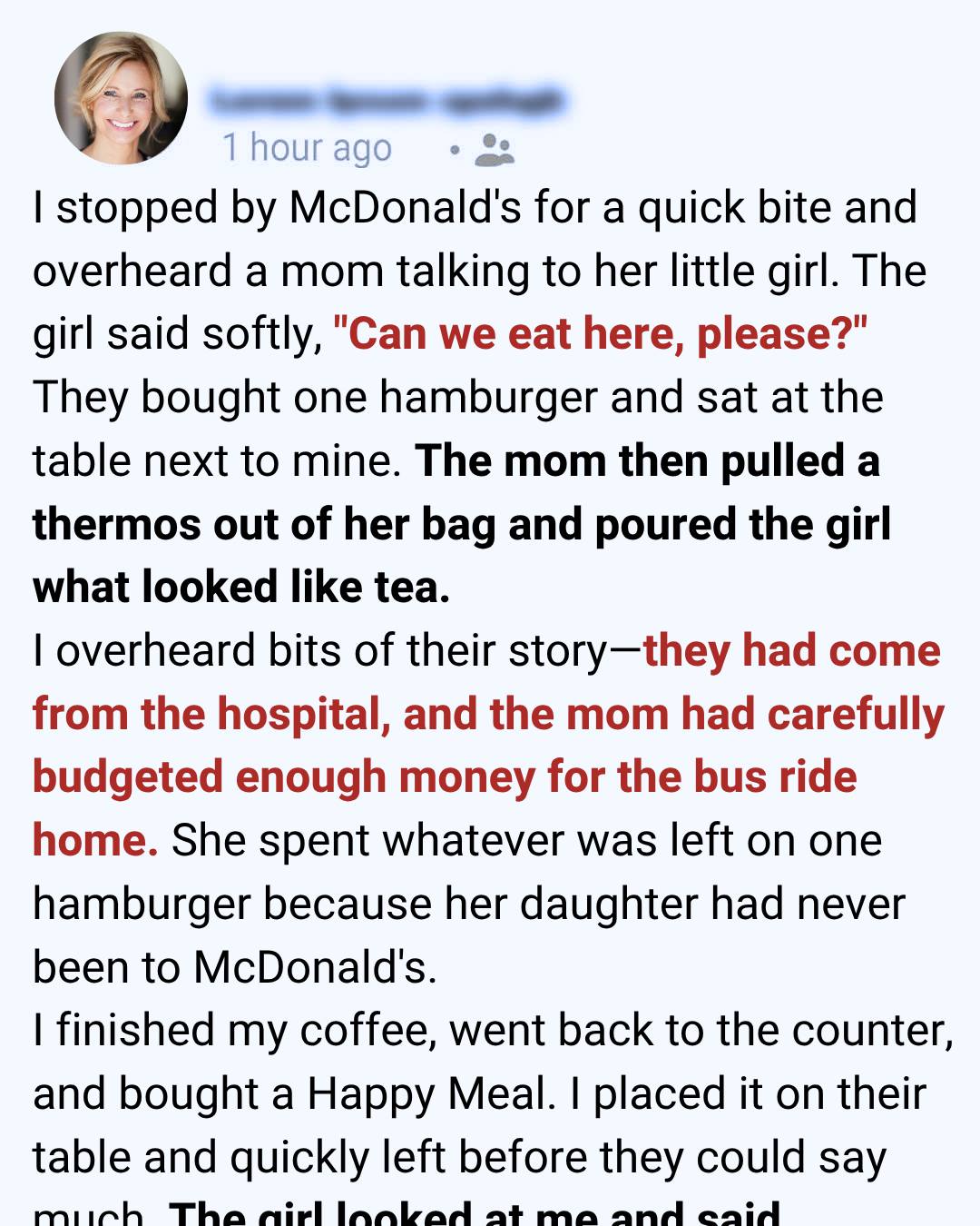 Wanting to add a touch of kindness to their day, I went back to the counter, bought a Happy Meal, and gently set it on their table before walking away so they wouldn’t feel pressured to respond.