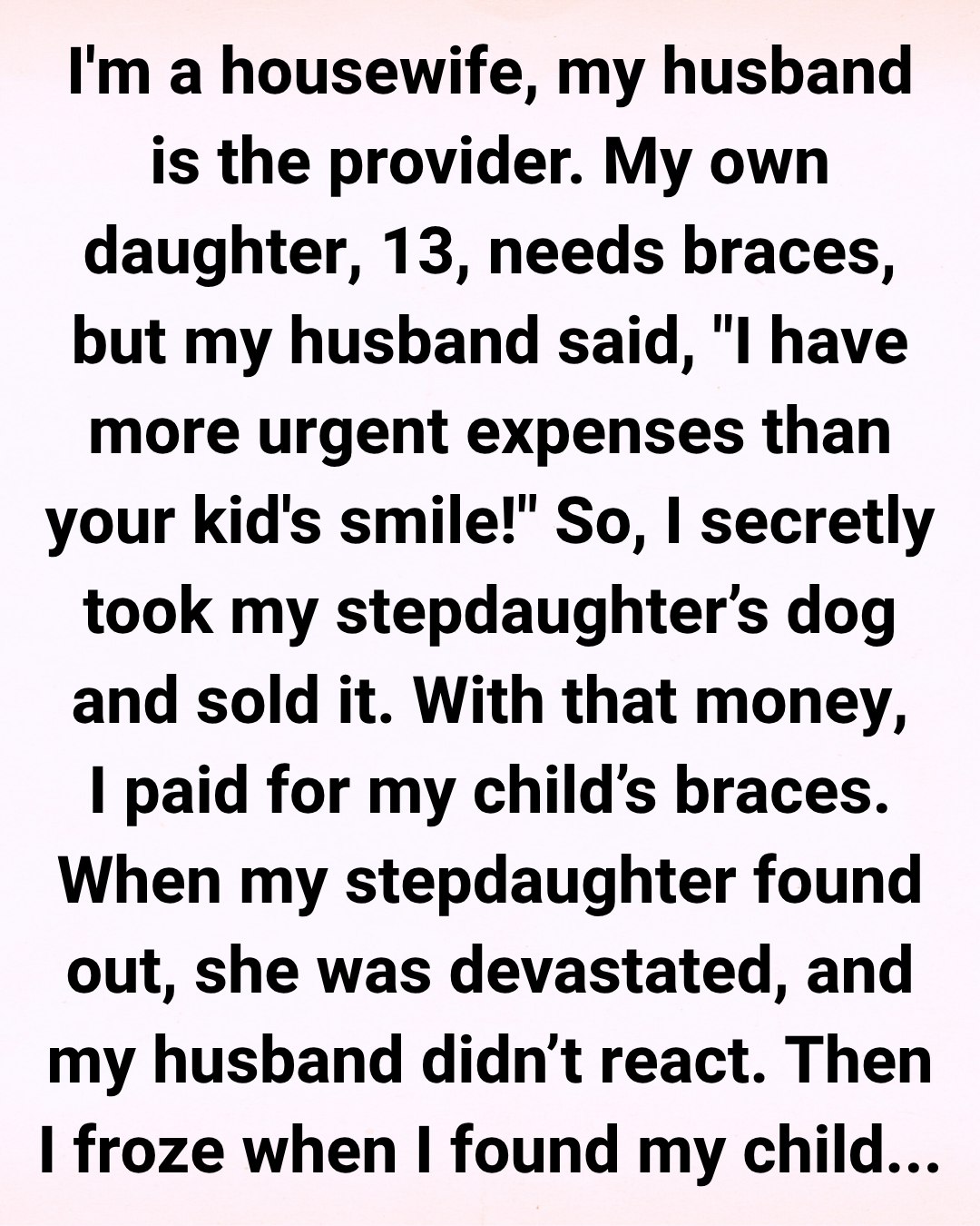 So, I made a terrible decision. I secretly took my stepdaughter’s dog and sold it. His food and care cost a lot, and since we were already in financial trouble, I convinced myself it was practical. With that money, I paid for my daughter’s braces.