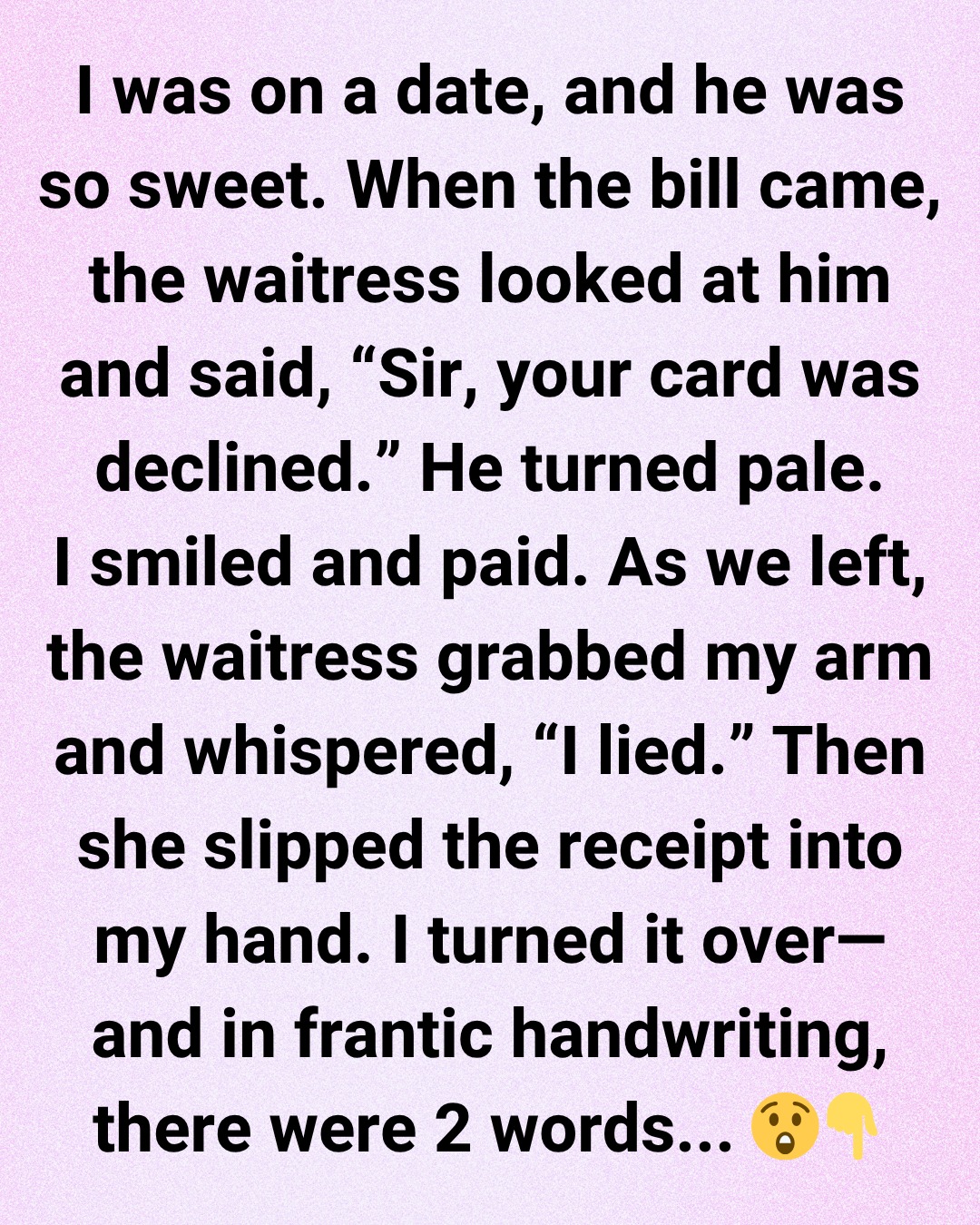 I couldn’t be more grateful to that waitress. Her courage, kindness, and quick thinking saved me from something terrible. I realized she had staged the declined card incident just to have an excuse to slip me that message.
