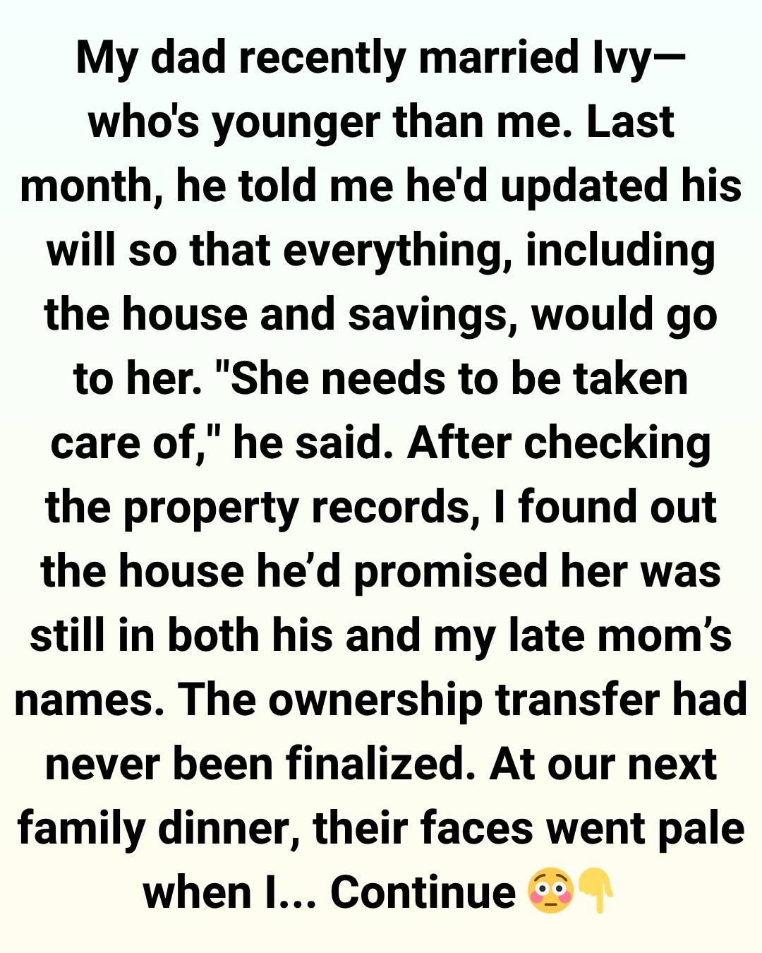 So I did some digging. After checking the property records, I discovered something he clearly hadn’t told her: the house he’d promised Ivy was still in both his and my late mom’s names. The ownership transfer had never been finalized — which meant half of it legally belonged to me.