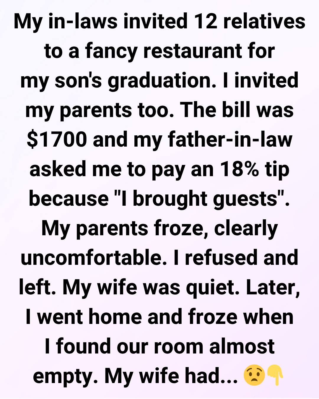 My in-laws had planned a big dinner to celebrate our son’s high school graduation. They chose a fancy restaurant downtown — the kind with chandeliers, linen napkins, and a menu without prices. Twelve relatives from my wife’s side were invited, and when I suggested that my parents join us too — after all, it was their grandson’s big day — my wife agreed without hesitation. I thought it would be a lovely, family-filled evening.