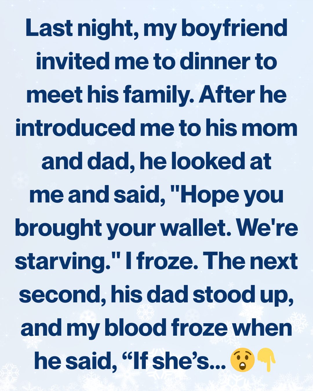 At first, I thought he was joking — a weird joke, but still a joke. But then his dad stood up like a judge about to sentence someone and cleared his throat dramatically. “If she’s already struggling now,” he announced to the table, “imagine the future.”