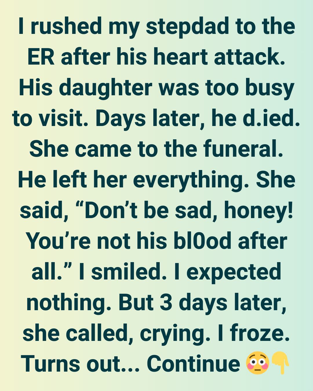 I’ll never forget the night everything changed. My stepdad, Henry, collapsed in the living room, clutching his chest. His face went gray, his breath shallow. I didn’t think—I just grabbed my keys, called 911, and rushed him to the ER.