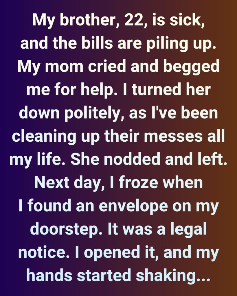 I wasn’t loved for who I was, just for what I could provide. I’m done being the dependable one. I’m done being the backup parent. I refuse to take care of my brother, because I’m not his mom, and apparently, I’m not even their daughter anymore.
