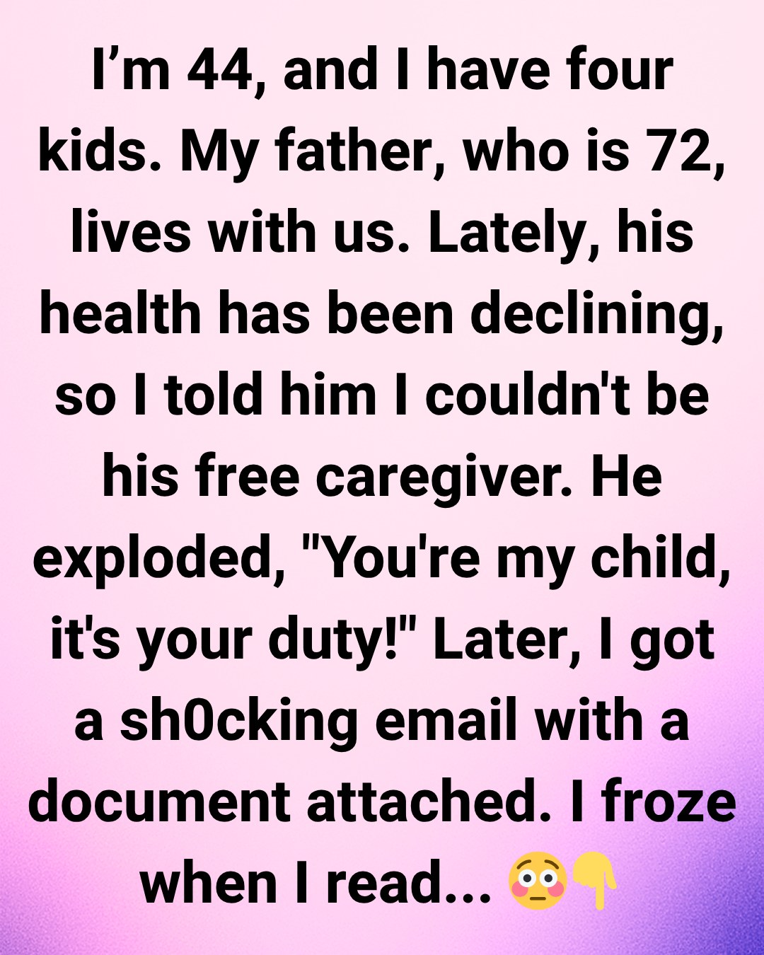 That same afternoon, my husband texted me, telling me to check our joint email urgently. When I opened it, I was stunned to see a nursing home agreement—already signed by my father. He had arranged everything on his own without even talking to me first.