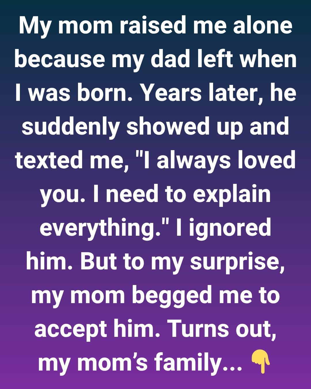 I didn’t reply. I ignored the message. But to my surprise, my mom actually begged me to talk to him. She said softly, “It wasn’t his fault because it was my family who pushed him out of our lives. I was young and scared, and I let them.”