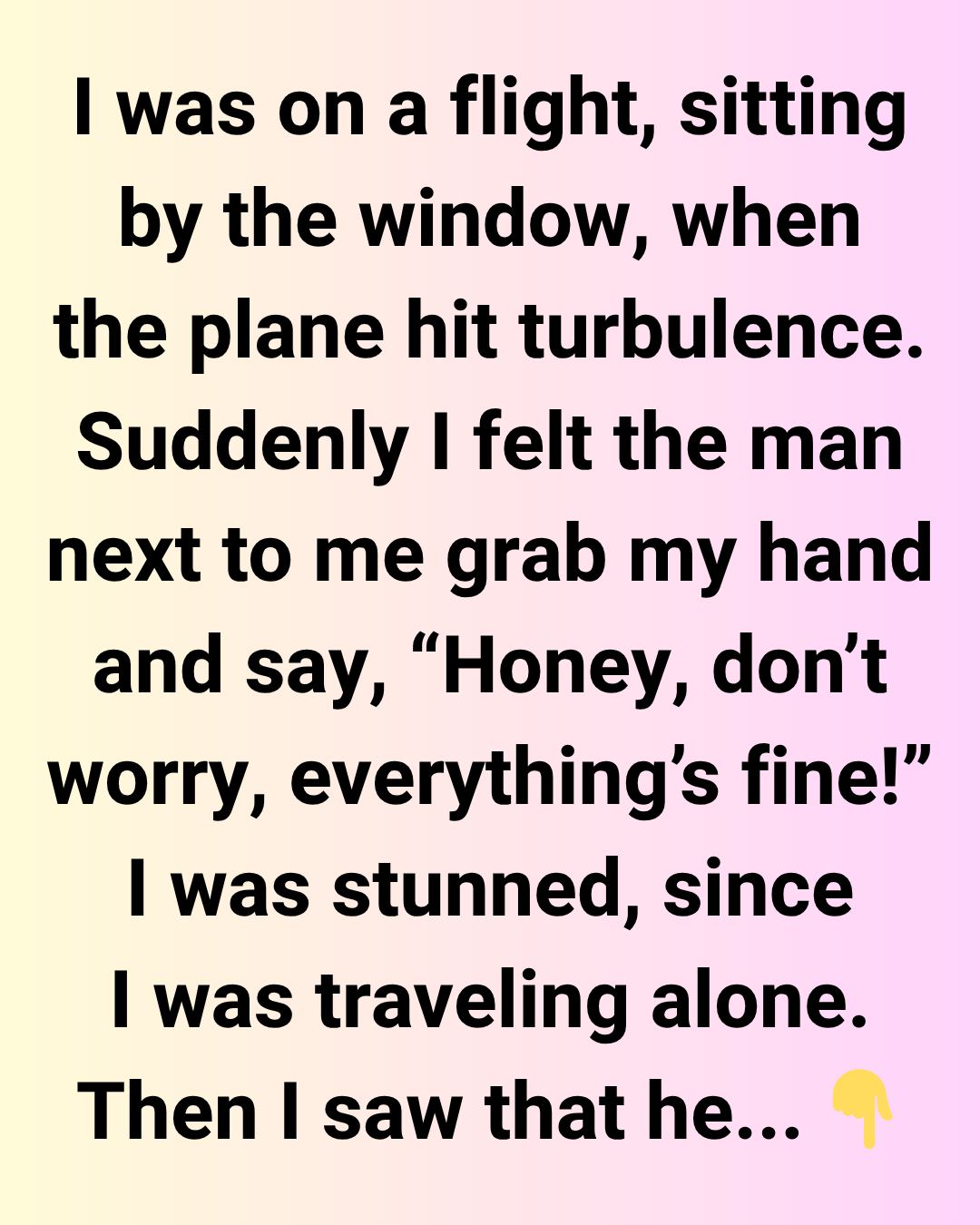 I was on a flight, sitting by the window, when the plane hit turbulence. Suddenly I felt the man next to me grab my hand and say, “Honey, don’t worry, everything’s fine!” I was stunned, since I was traveling alone. Then I saw that he had gone pale, and realized he’d gotten so nervous that he mistook me for his wife, who was actually sitting on his other side. I just smiled quietly so his wife wouldn’t notice. Turned out he was a very sensitive man.