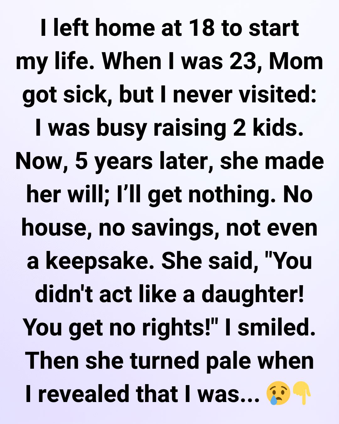 When I was 23, Mom got sick, but I never visited: I was busy raising 2 kids and facing my own struggles. Now, 5 years later, she made her will; I’ll get nothing. No house, no savings, not even a keepsake.