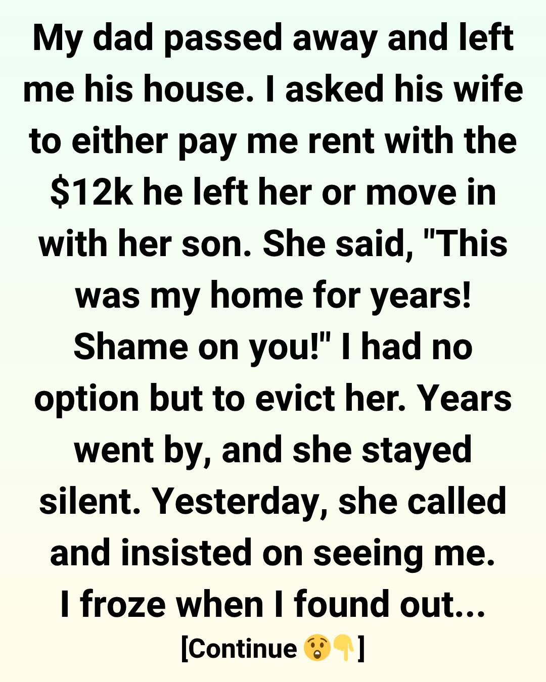 My dad passed away and left me his house. I asked his wife to either pay me rent with the $12k he left her or move in with her son. She said, “This was my home for years! Shame on you!” I had no option but to evict her.